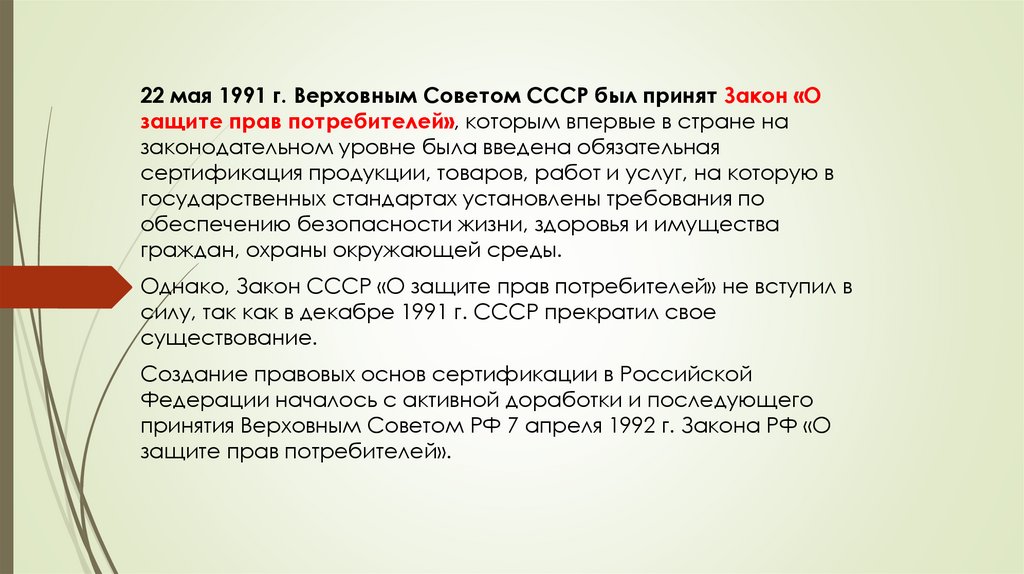 22 мая 1991 г. Верховным Советом СССР был принят Закон «Озащите прав потребителей», которым впервые в стране на