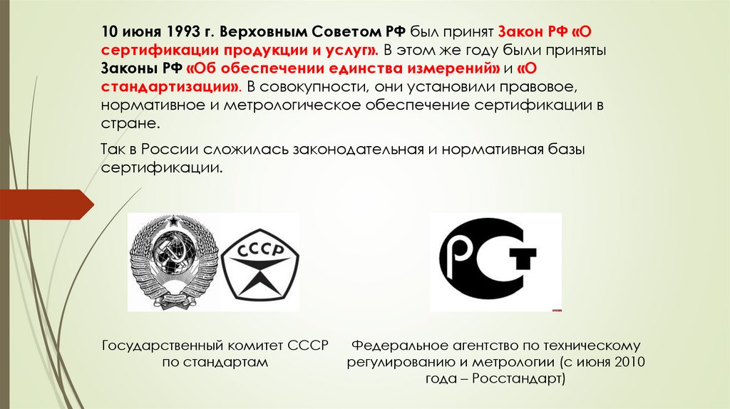 10 июня 1993 г. Верховным Советом РФ был принят Закон РФ «Осертификации продукции и услуг». В этом же году были приняты