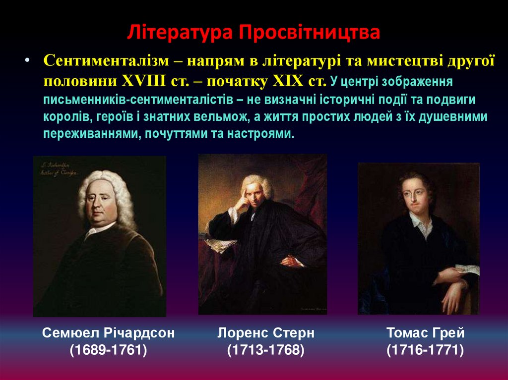 • філософіїя: Дж.Локк, К.А., Гельвецій, Е.К.Шефтсберіживопис: В.Хогарт, Т.Гейнсборо,Ж.Б.Грез, Ж.Б.С.Шарден та ін.