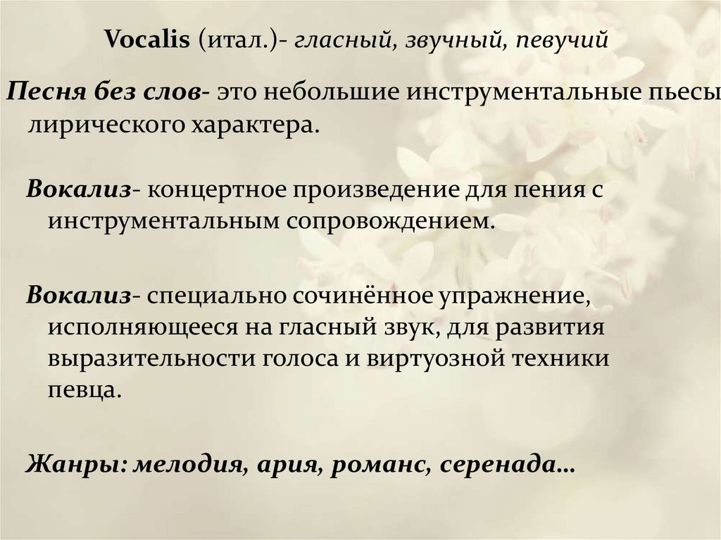 Vocalis (итал.)- гласный, звучный, певучийПесня без слов- это небольшие инструментальные пьесы