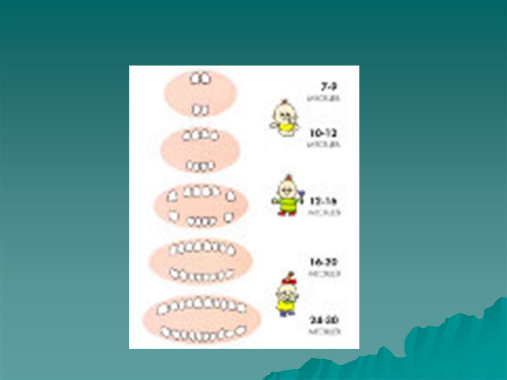 Всего молочных зубов – 20-ть: 8 резцов, 8 коренных, 4 клыка.