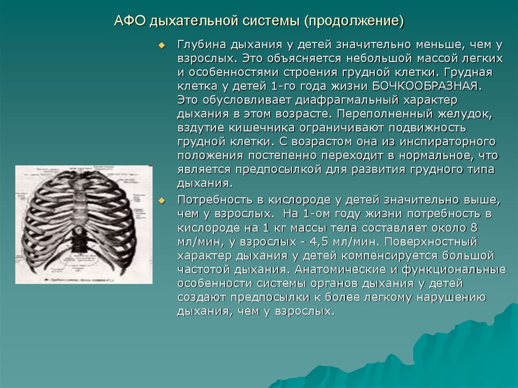 АФО дыхательной системы (продолжение)Глубина дыхания у детей значительно меньше, чем у