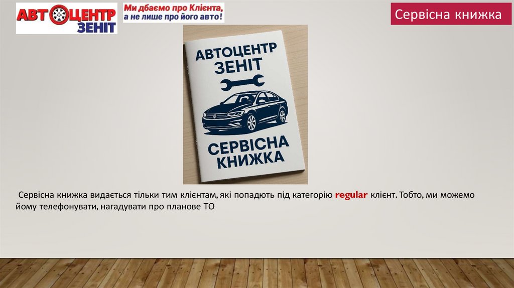 Сервісна книжкаСервісна книжка видається тільки тим клієнтам, які попадють під категорію regular клієнт. Тобто, ми можемо