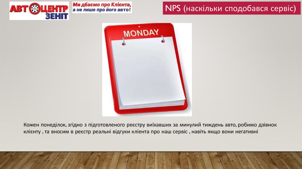 NPS (наскільки сподобався сервіс)Кожен понеділок, згідно з підготовленого реєстру виїхавших за минулий тиждень авто, робимо дзівнок