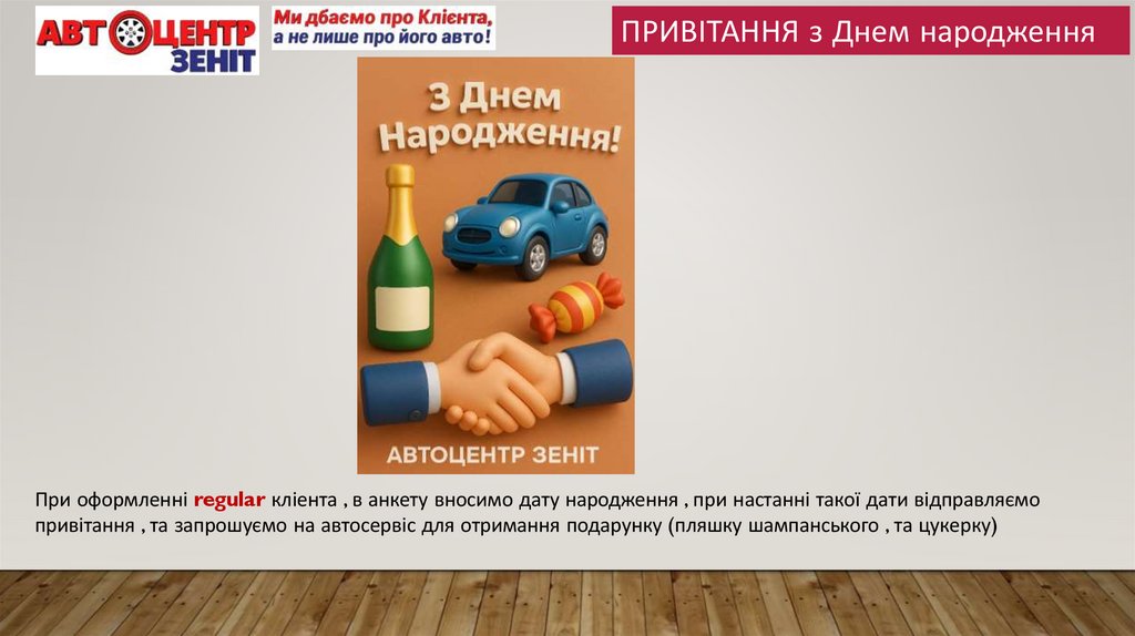 ПРИВІТАННЯ з Днем народженняПри оформленні regular кліента , в анкету вносимо дату народження , при настанні такої дати відправляємо