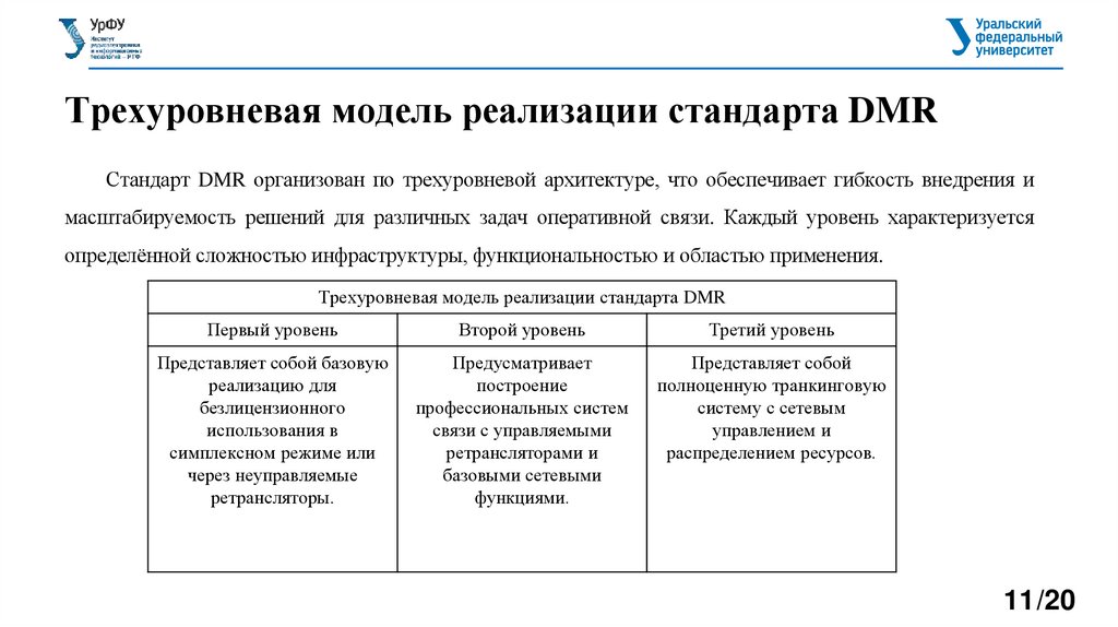Трехуровневая модель реализации стандарта DMRСтандарт DMR организован по трехуровневой архитектуре, что обеспечивает гибкость внедрения и
