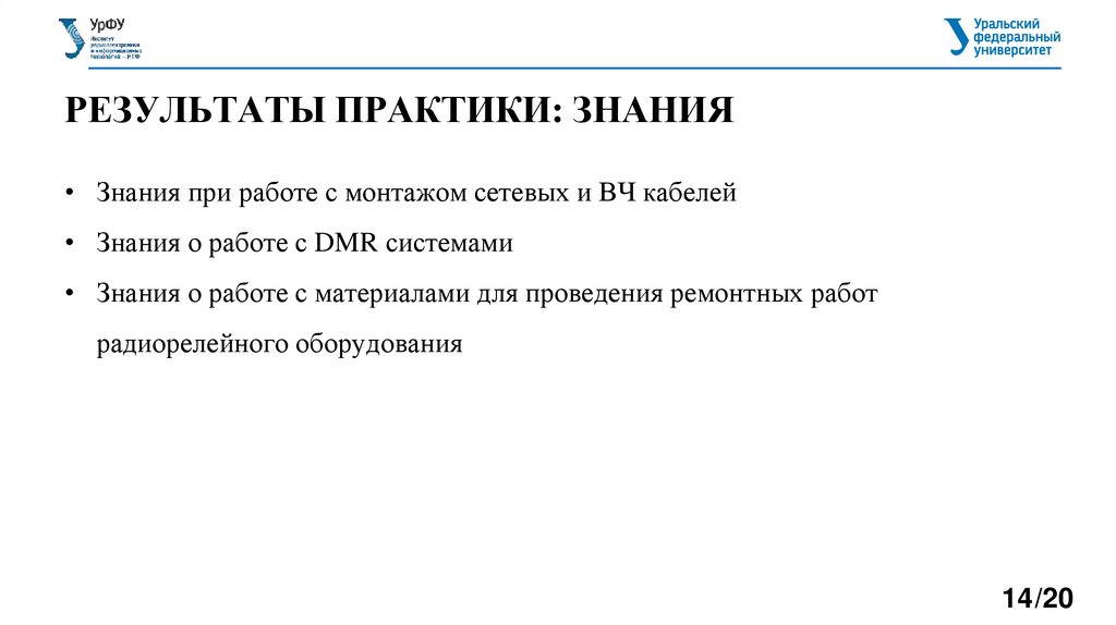 РЕЗУЛЬТАТЫ ПРАКТИКИ: ЗНАНИЯ• Знания при работе с монтажом сетевых и ВЧ кабелей