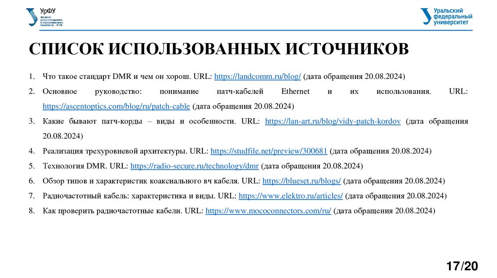 СПИСОК ИСПОЛЬЗОВАННЫХ ИСТОЧНИКОВ1. Что такое стандарт DMR и чем он хорош. URL: https://landcomm.ru/blog/ (дата обращения 20.08.2024)