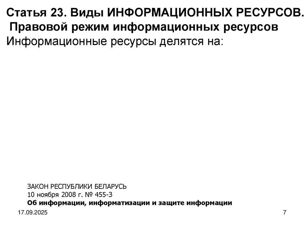 Статья 23. Виды ИНФОРМАЦИОННЫХ РЕСУРСОВ.Правовой режим информационных ресурсов