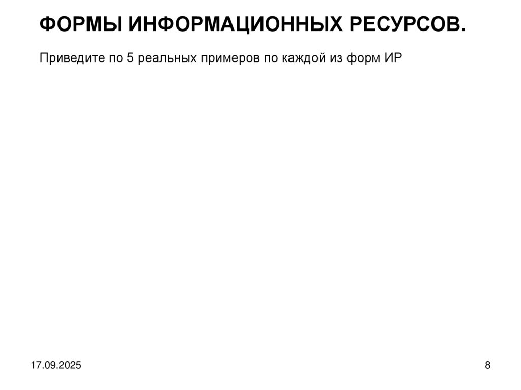 ФОРМЫ ИНФОРМАЦИОННЫХ РЕСУРСОВ.Приведите по 5 реальных примеров по каждой из форм ИР