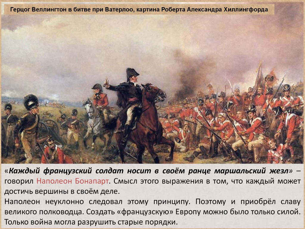 Герцог Веллингтон в битве при Ватерлоо, картина Роберта Александра Хиллингфорда«Каждый французский солдат носит в своём ранце маршальский жезл» –
