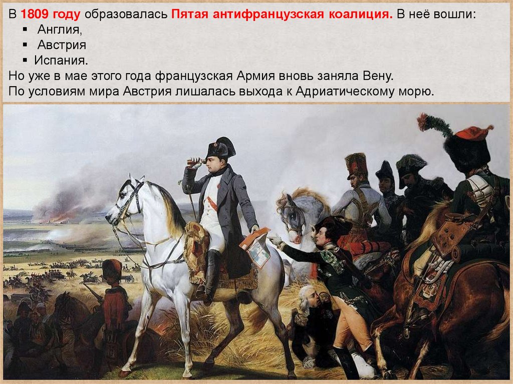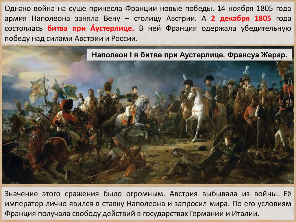 Однако война на суше принесла Франции новые победы. 14 ноября 1805 годаармия Наполеона заняла Вену – столицу Австрии. А 2 декабря 1805 года