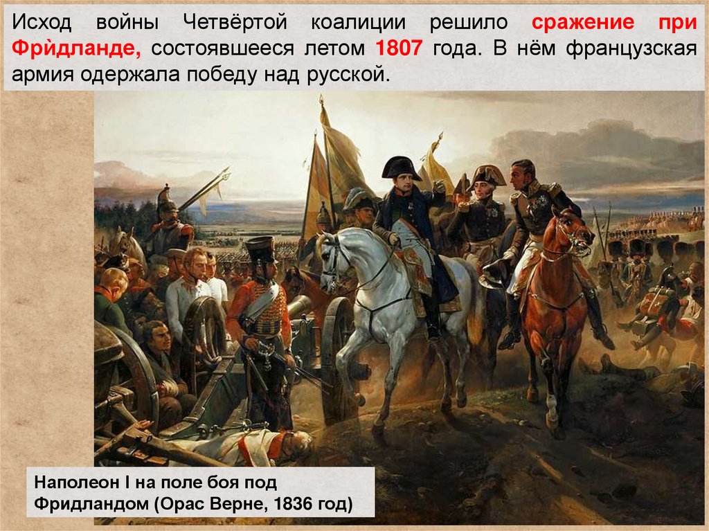 Исход войны Четвёртой коалиции решило сражение приФрѝдланде, состоявшееся летом 1807 года. В нём французская
