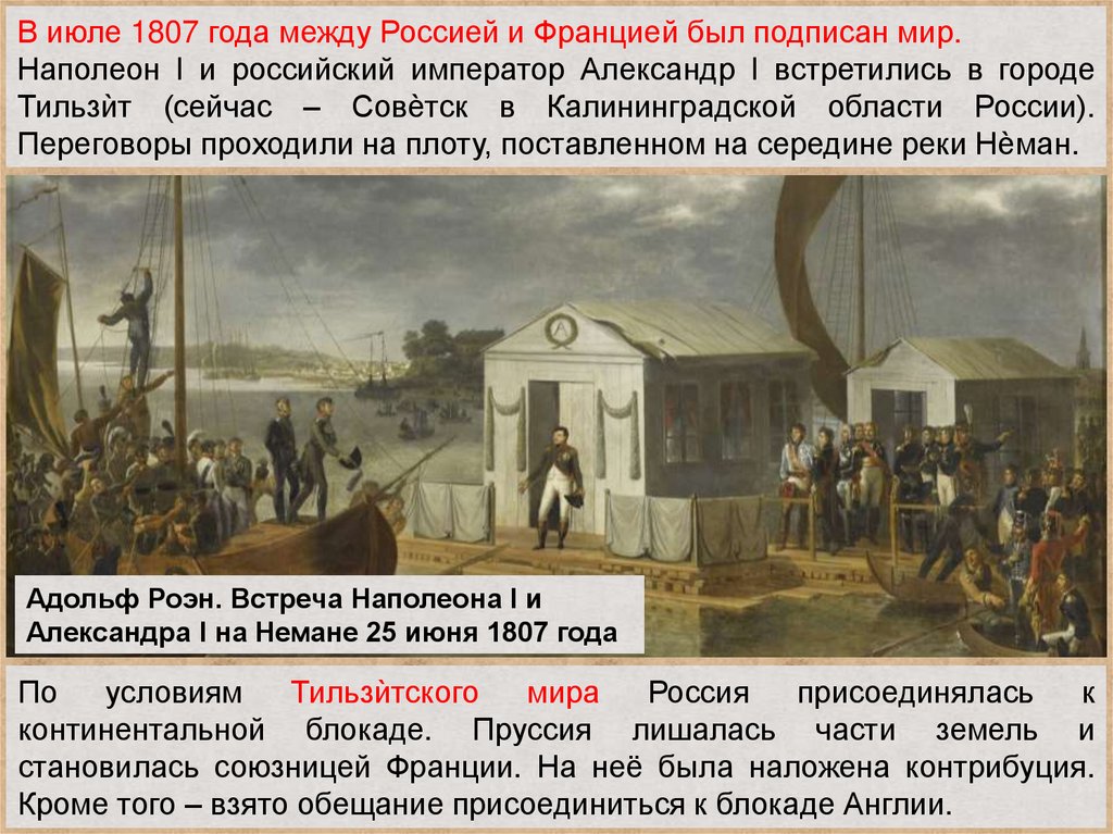 В июле 1807 года между Россией и Францией был подписан мир.Наполеон I и российский император Александр I встретились в городе