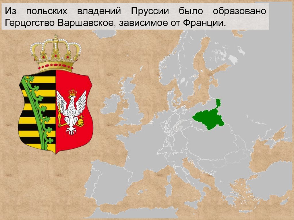 Из польских владений Пруссии было образованоГерцогство Варшавское, зависимое от Франции.