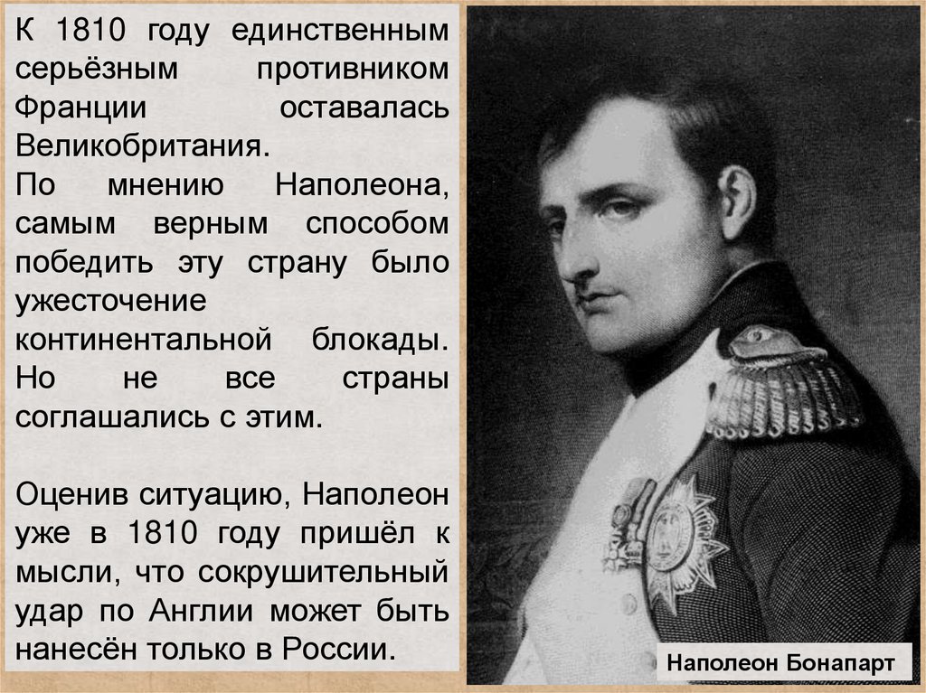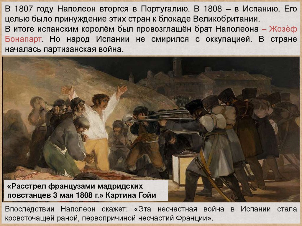 В 1807 году Наполеон вторгся в Португалию. В 1808 – в Испанию. Егоцелью было принуждение этих стран к блокаде Великобритании.