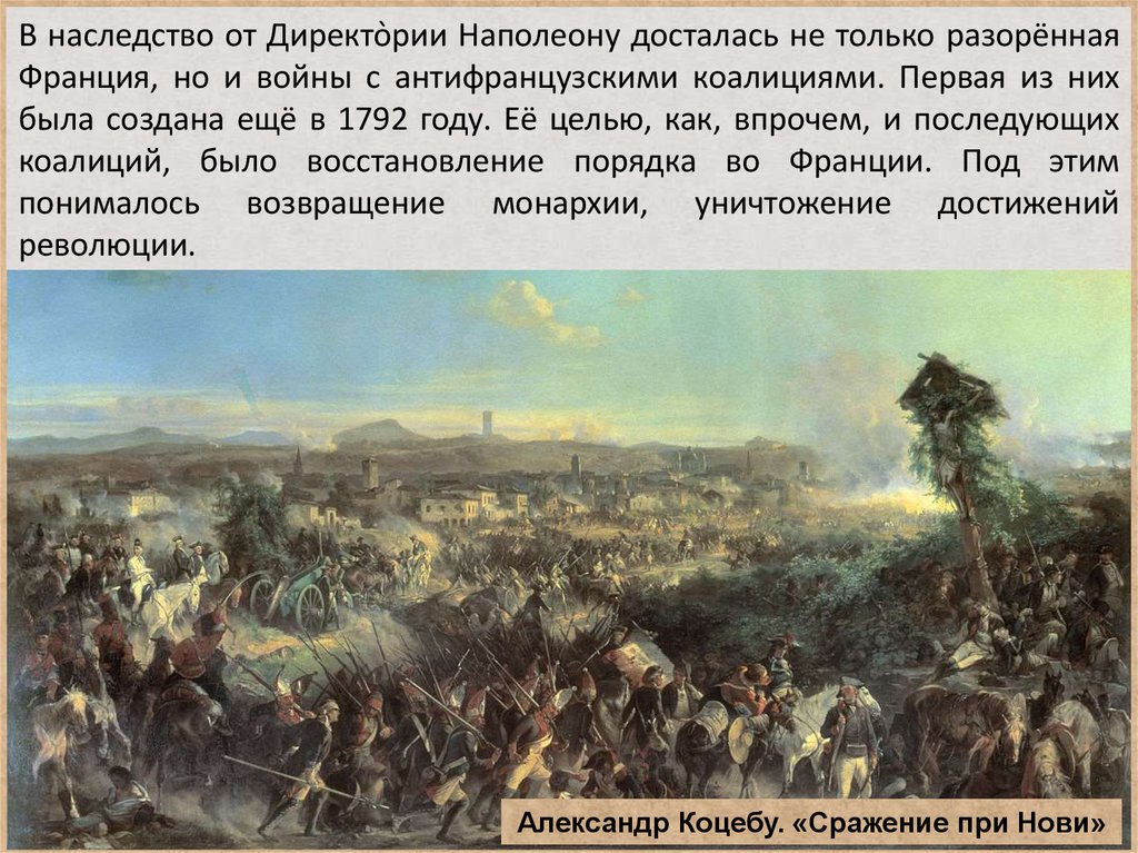 В наследство от Директо̀ рии Наполеону досталась не только разорённаяФранция, но и войны с антифранцузскими коалициями. Первая из них