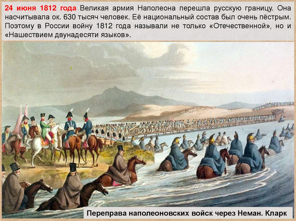 24 июня 1812 года Великая армия Наполеона перешла русскую границу. Онанасчитывала ок. 630 тысяч человек. Её национальный состав был очень пёстрым.