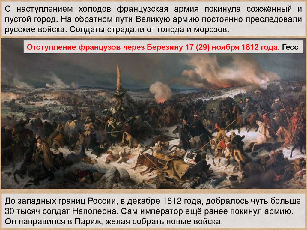 С наступлением холодов французская армия покинула сожжённый ипустой город. На обратном пути Великую армию постоянно преследовали