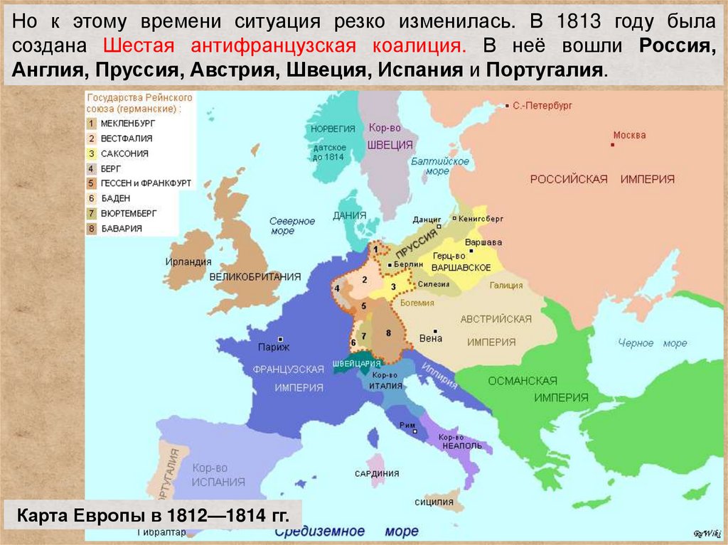Но к этому времени ситуация резко изменилась. В 1813 году быласоздана Шестая антифранцузская коалиция. В неё вошли Россия,