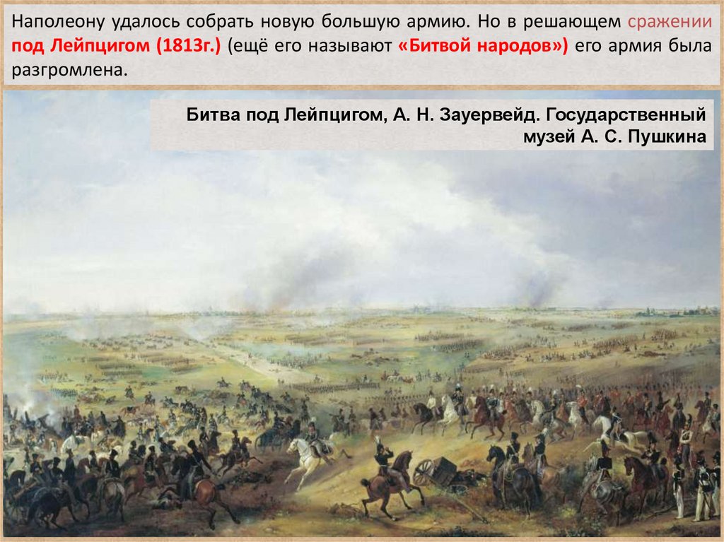 Наполеону удалось собрать новую большую армию. Но в решающем сражениипод Лейпцигом (1813г.) (ещё его называют «Битвой народов») его армия была