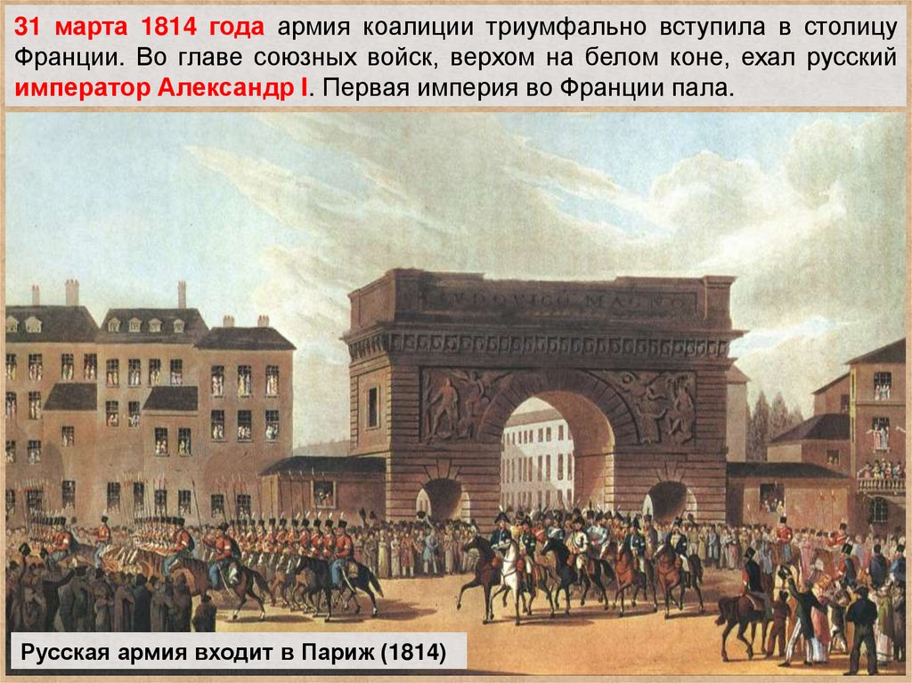 31 марта 1814 года армия коалиции триумфально вступила в столицуФранции. Во главе союзных войск, верхом на белом коне, ехал русский