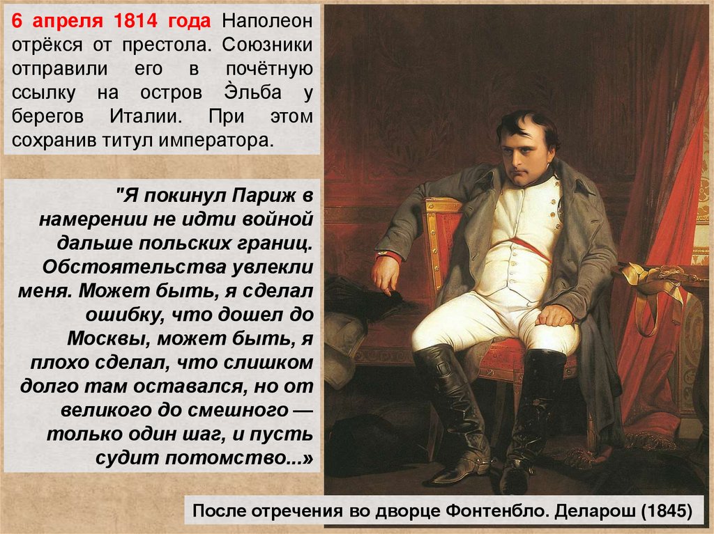 6 апреля 1814 года Наполеонотрёкся от престола. Союзники