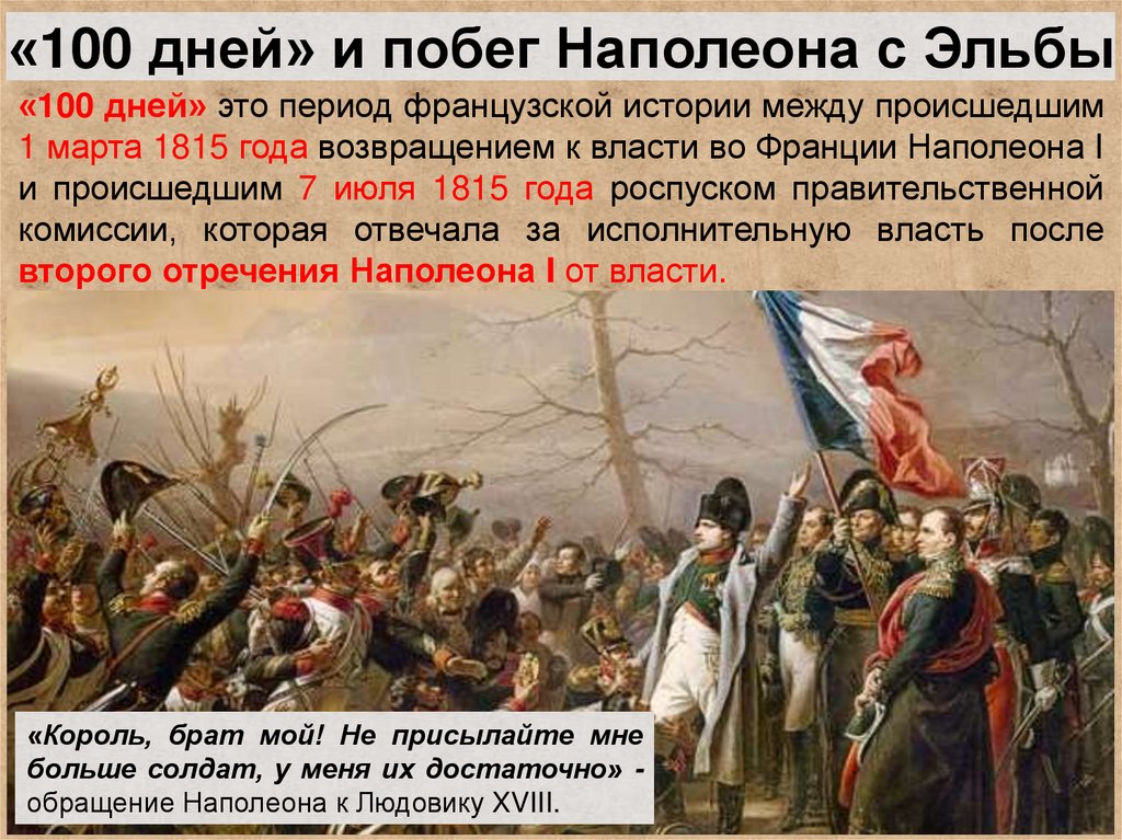 «100 дней» и побег Наполеона с Эльбы«100 дней» это период французской истории между происшедшим