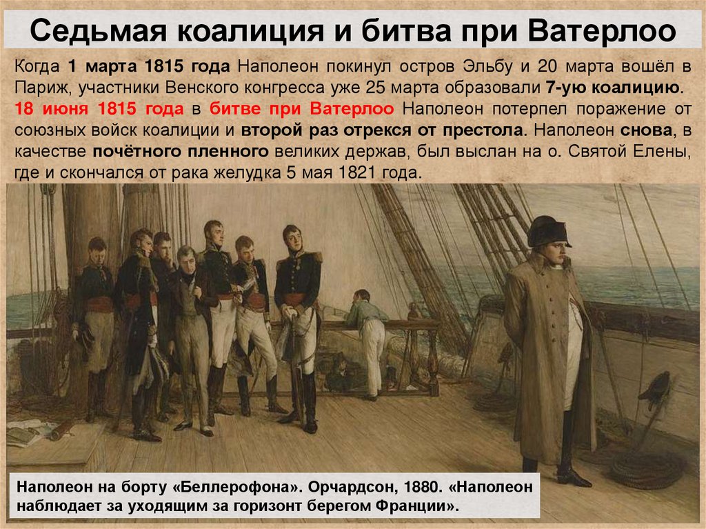 Седьмая коалиция и битва при ВатерлооКогда 1 марта 1815 года Наполеон покинул остров Эльбу и 20 марта вошёл в