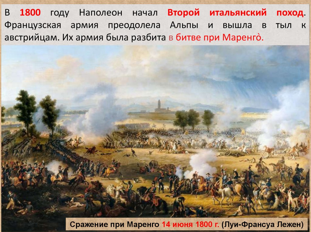 В 1800 году Наполеон начал Второй итальянский поход.Французская армия преодолела Альпы и вышла в тыл к