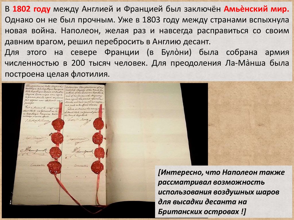 В 1802 году между Англией и Францией был заключён Амьѐнский мир.Однако он не был прочным. Уже в 1803 году между странами вспыхнула