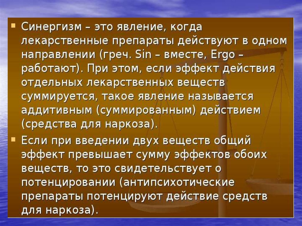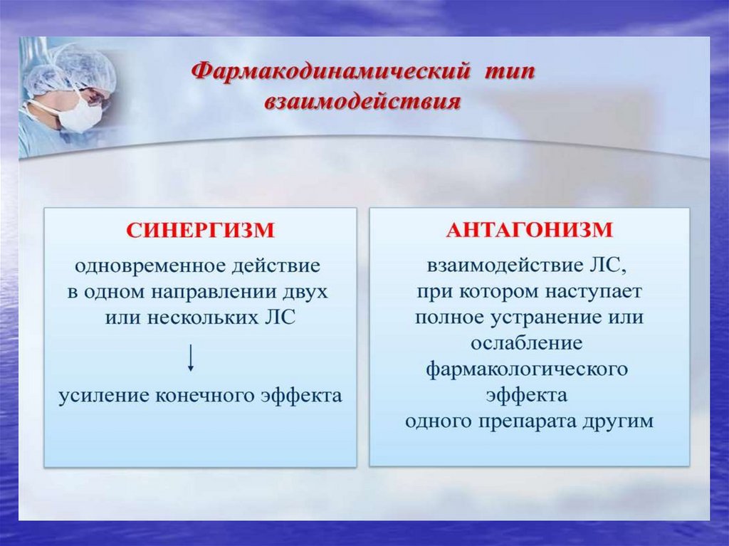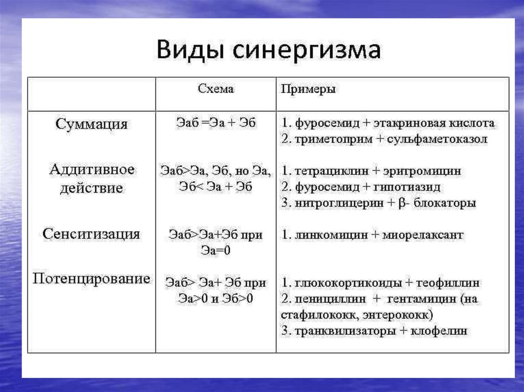 • Синергизм – однонаправленное действие двух и более Л,обеспечивающее более высокий фармакологический эффект,