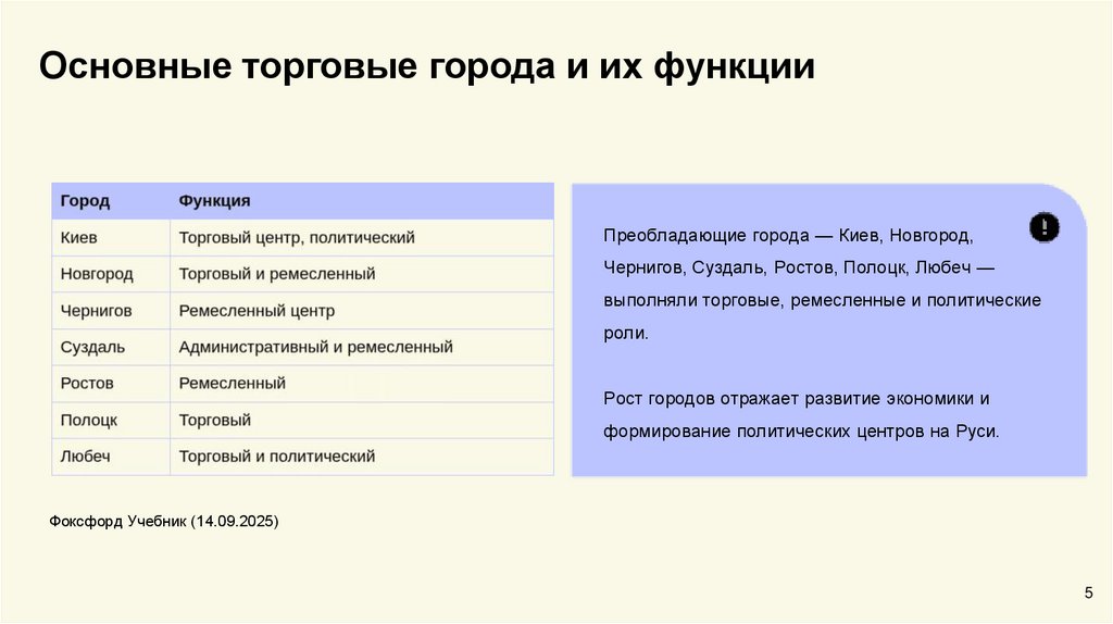 Основные торговые города и их функцииПреобладающие города — Киев, Новгород,