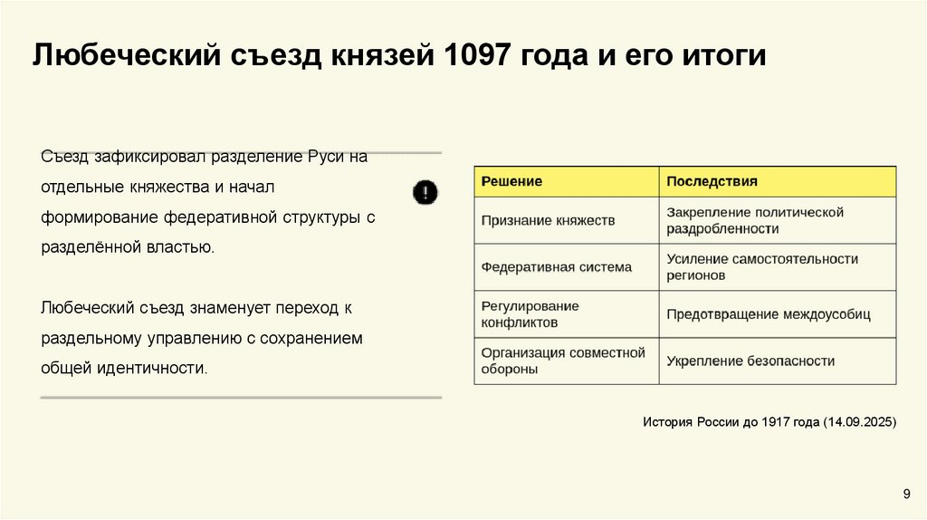 Любеческий съезд князей 1097 года и его итогиСъезд зафиксировал разделение Руси на