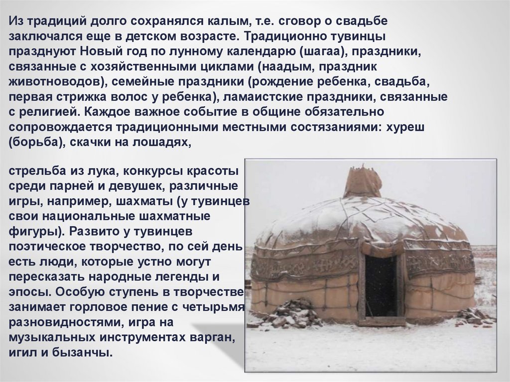 Из традиций долго сохранялся калым, т.е. сговор о свадьбезаключался еще в детском возрасте. Традиционно тувинцы