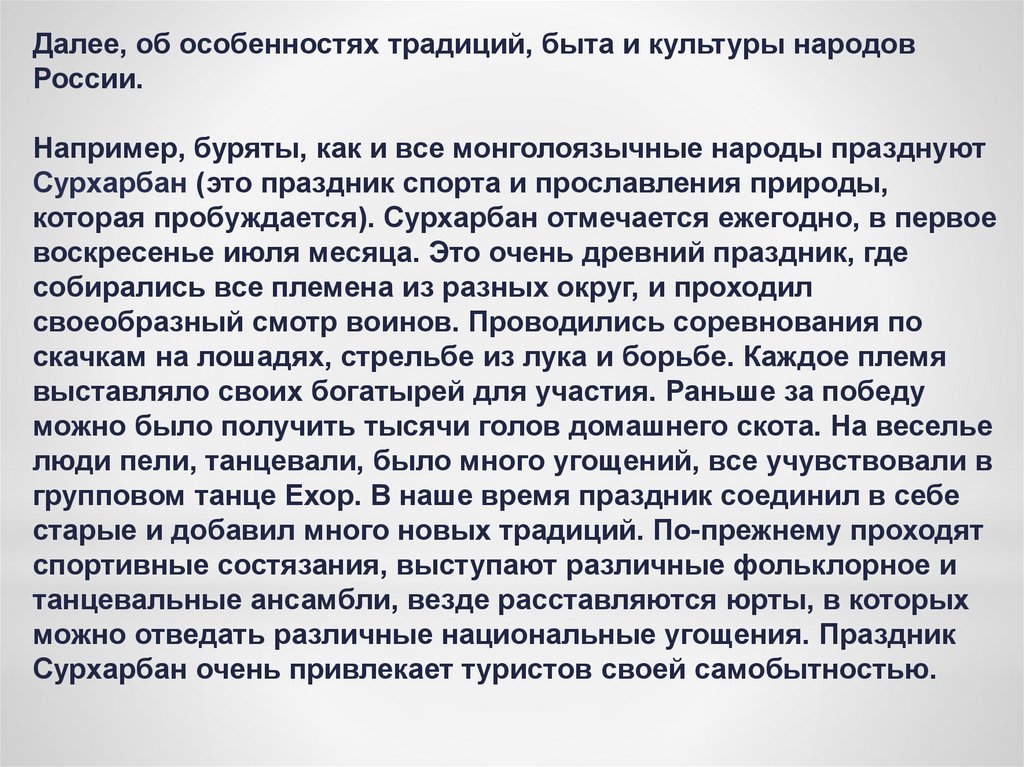Далее, об особенностях традиций, быта и культуры народовРоссии.