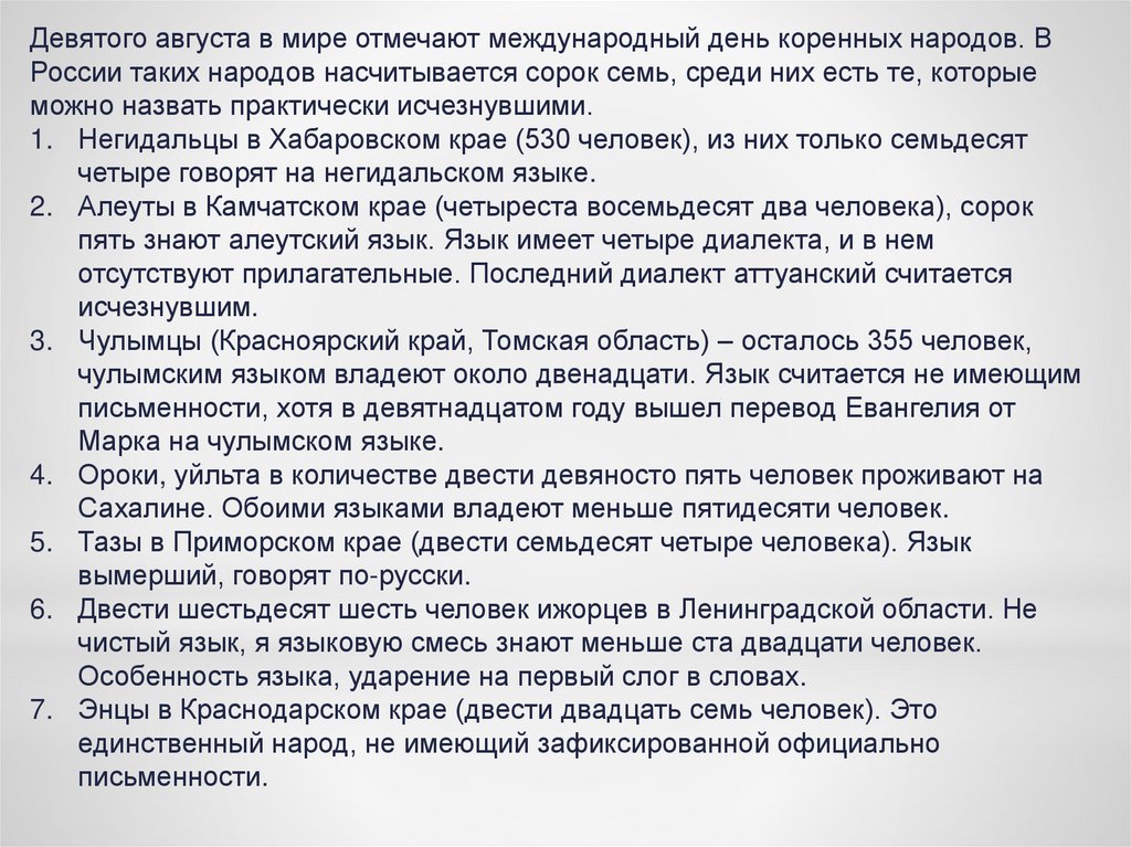 Девятого августа в мире отмечают международный день коренных народов. ВРоссии таких народов насчитывается сорок семь, среди них есть те, которые