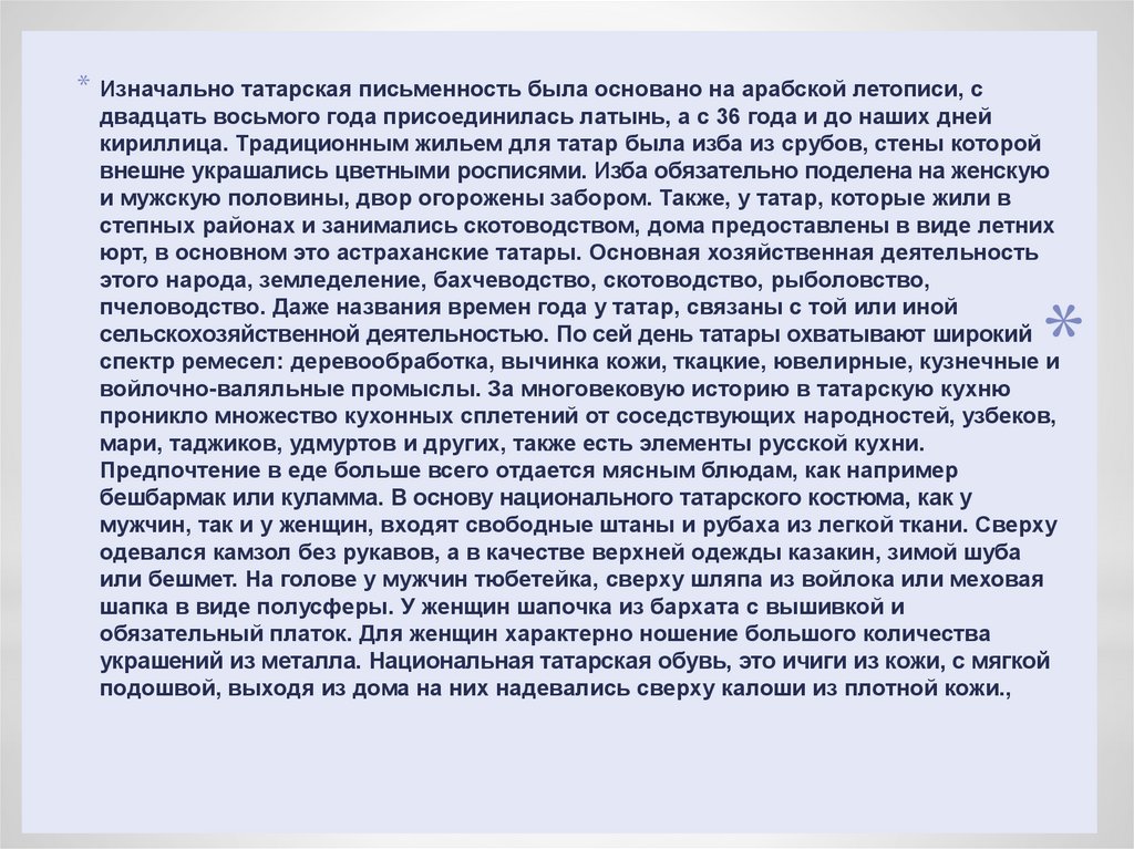 * Изначально татарская письменность была основано на арабской летописи, сдвадцать восьмого года присоединилась латынь, а с 36 года и до наших дней