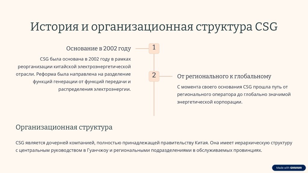 CSG является дочерней компанией, полностью принадлежащей правительству Китая. Она имеет иерархическую структуру