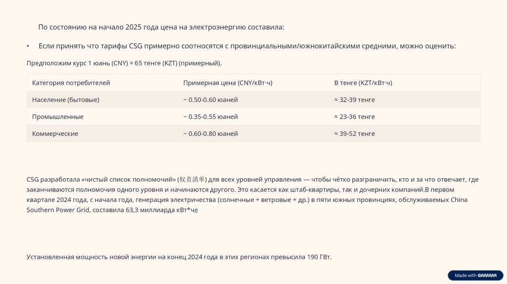 По состоянию на начало 2025 года цена на электроэнергию составила:Если принять что тарифы CSG примерно соотносятся с провинциальными/южнокитайскими средними, можно оценить: