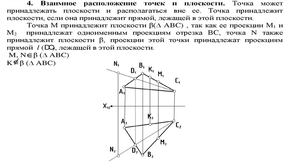 4. Взаимное расположение точек и плоскости. Точка можетпринадлежать плоскости и располагаться вне ее. Точка принадлежит