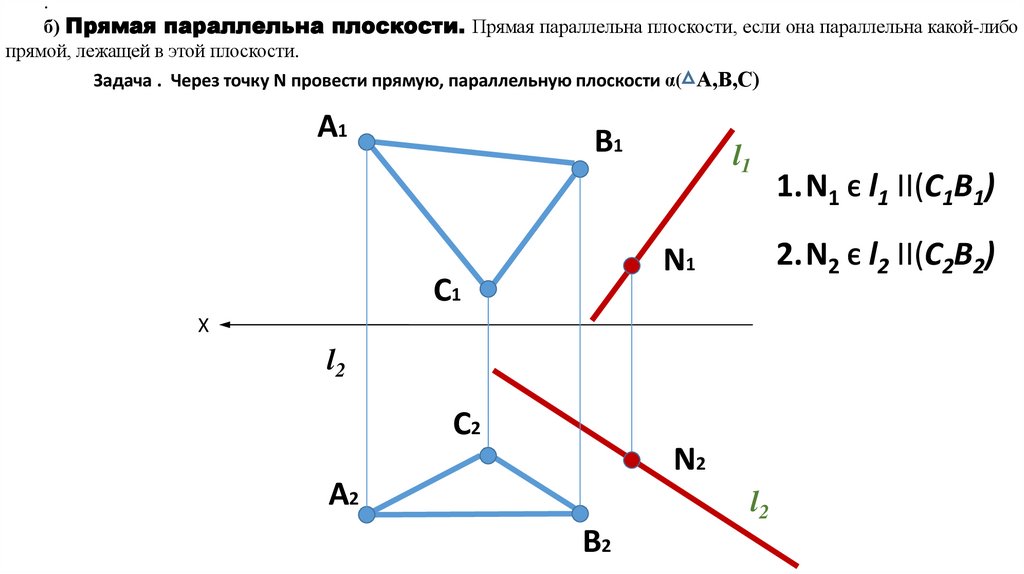 точек А, В, С и прямой l. Точка В принадлежит прямой (т.к. обе проекции точки принадлежат проекциям прямой),