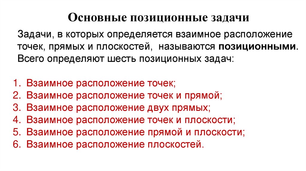 Основные позиционные задачиЗадачи, в которых определяется взаимное расположение