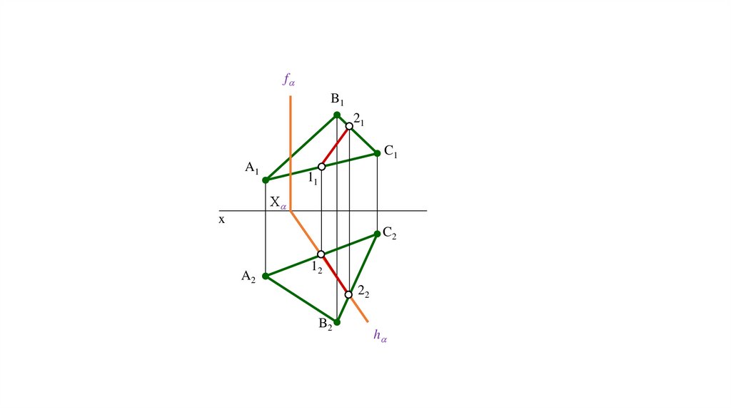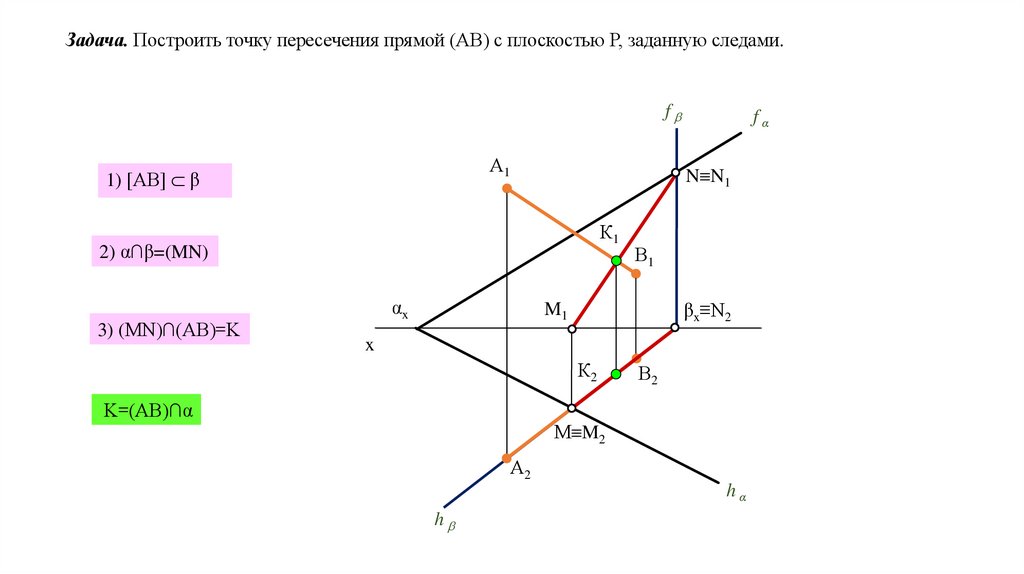 Задача. Построить точку пересечения прямой (АВ) с плоскостью Р, заданную следами.f