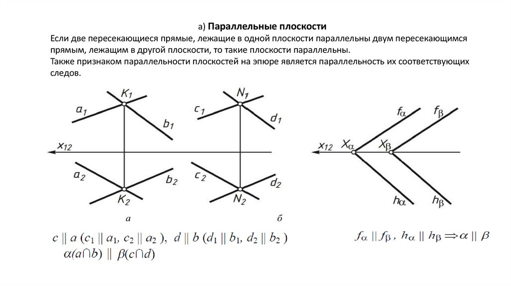 а) Параллельные плоскостиЕсли две пересекающиеся прямые, лежащие в одной плоскости параллельны двум пересекающимся