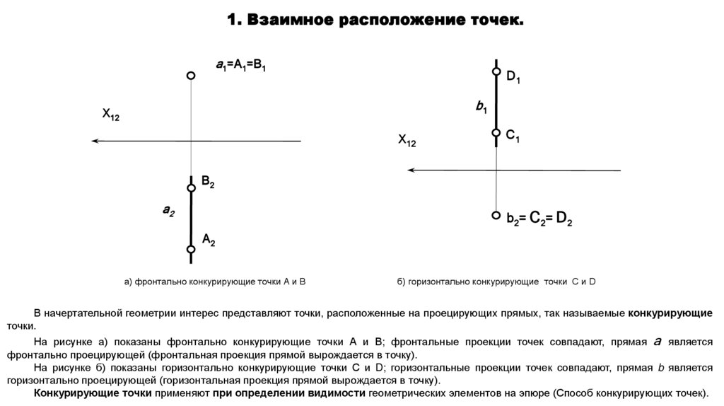 В начертательной геометрии интерес представляют точки, расположенные на проецирующих прямых, так называемые конкурирующие