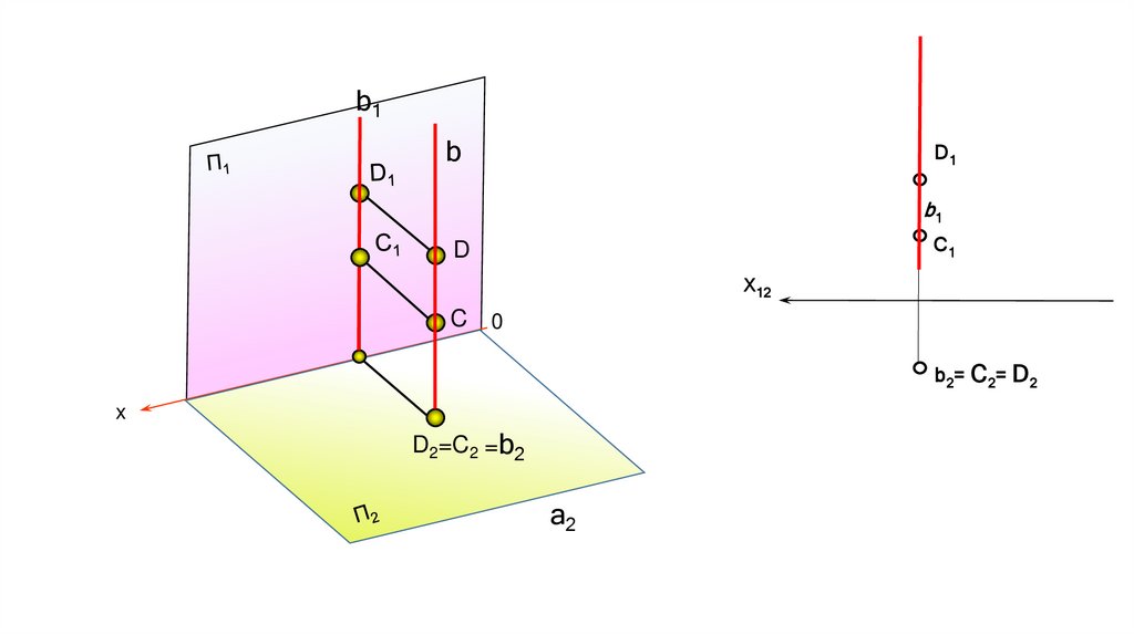 На рисунке б) показаны горизонтально конкурирующие точки С и D; горизонтальные проекции точек совпадают, прямая b является