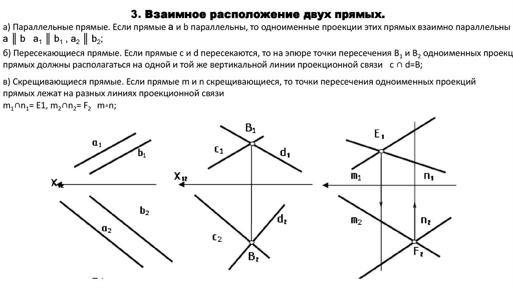 г) Конкурирующие прямые. Если одна пара проекций двух проекций прямых совпадают, то такие прямые являютсяконкурирующими.