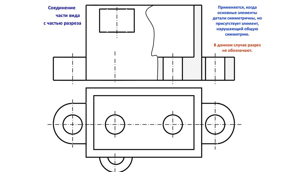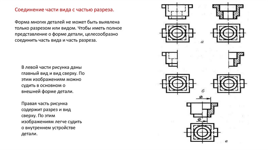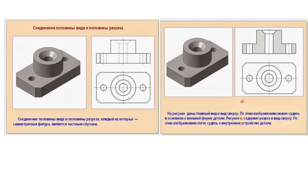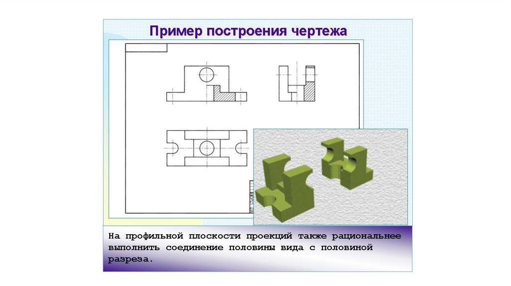 На профильной плоскости проекций также рациональнеевыполнить соединение половины вида с половиной