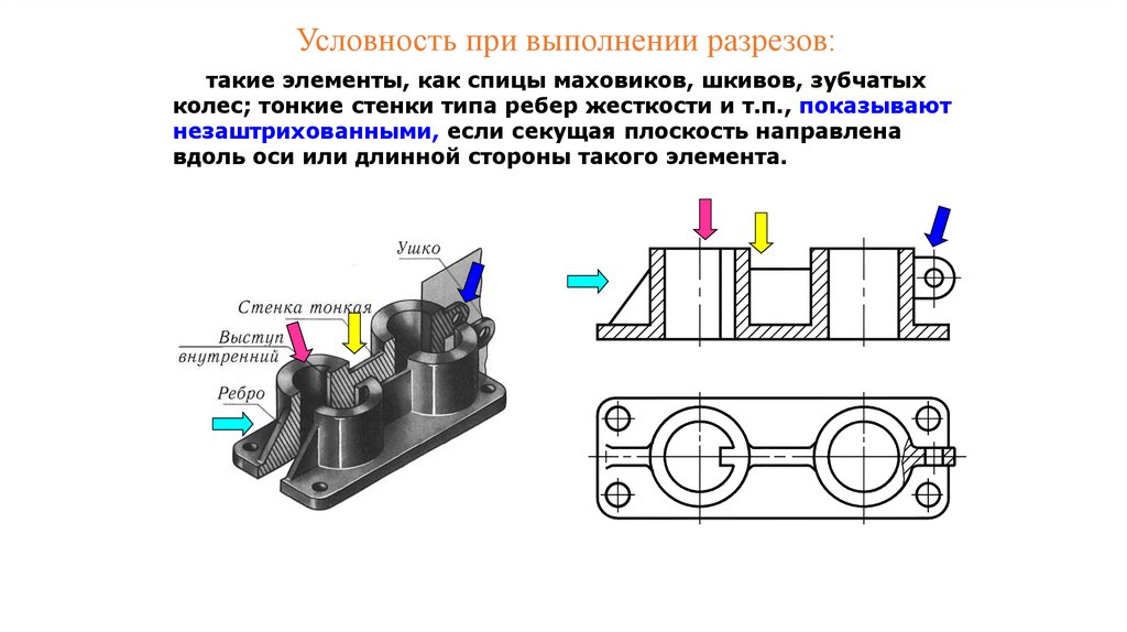 Условность при выполнении разрезов:такие элементы, как спицы маховиков, шкивов, зубчатых